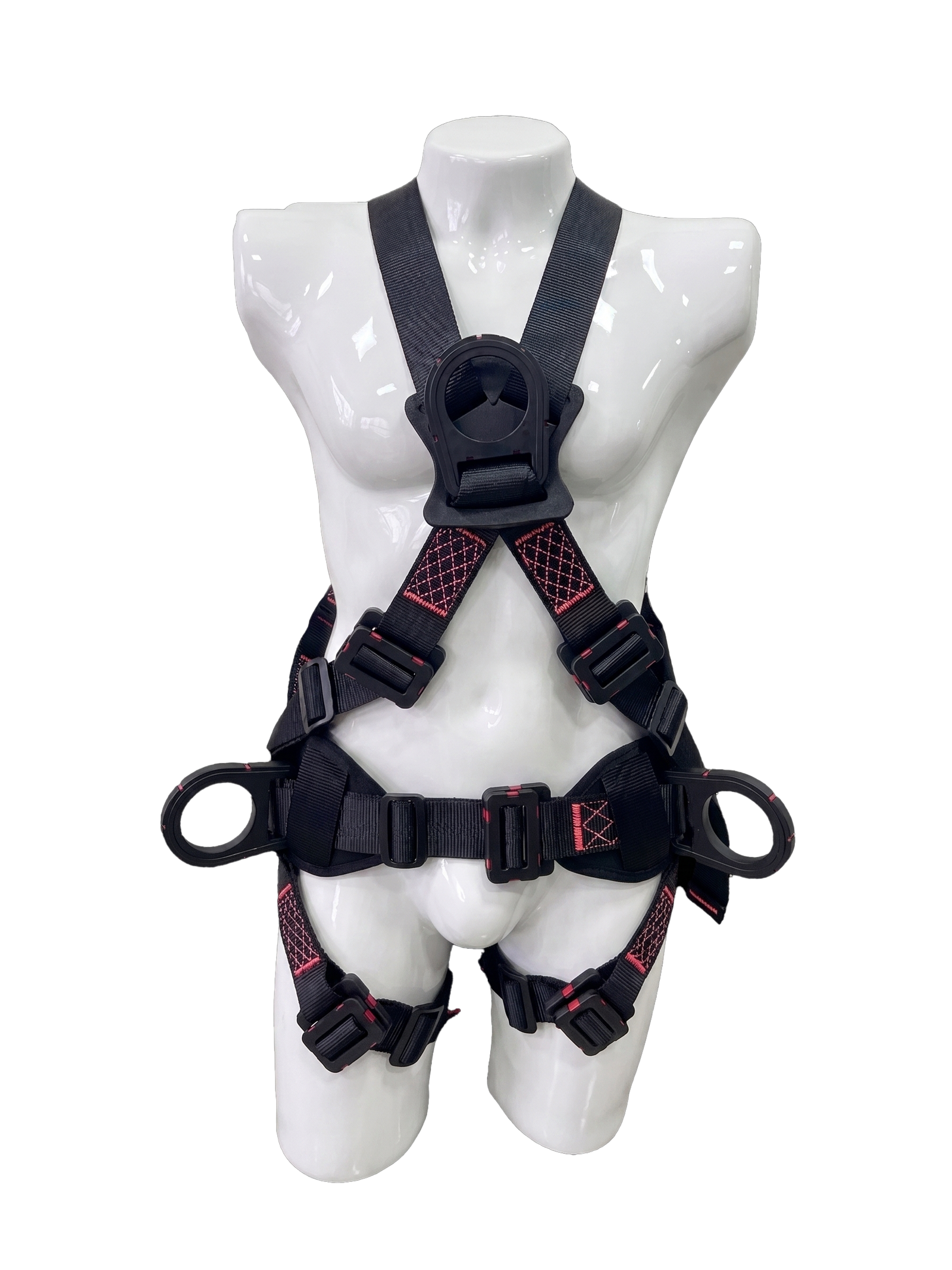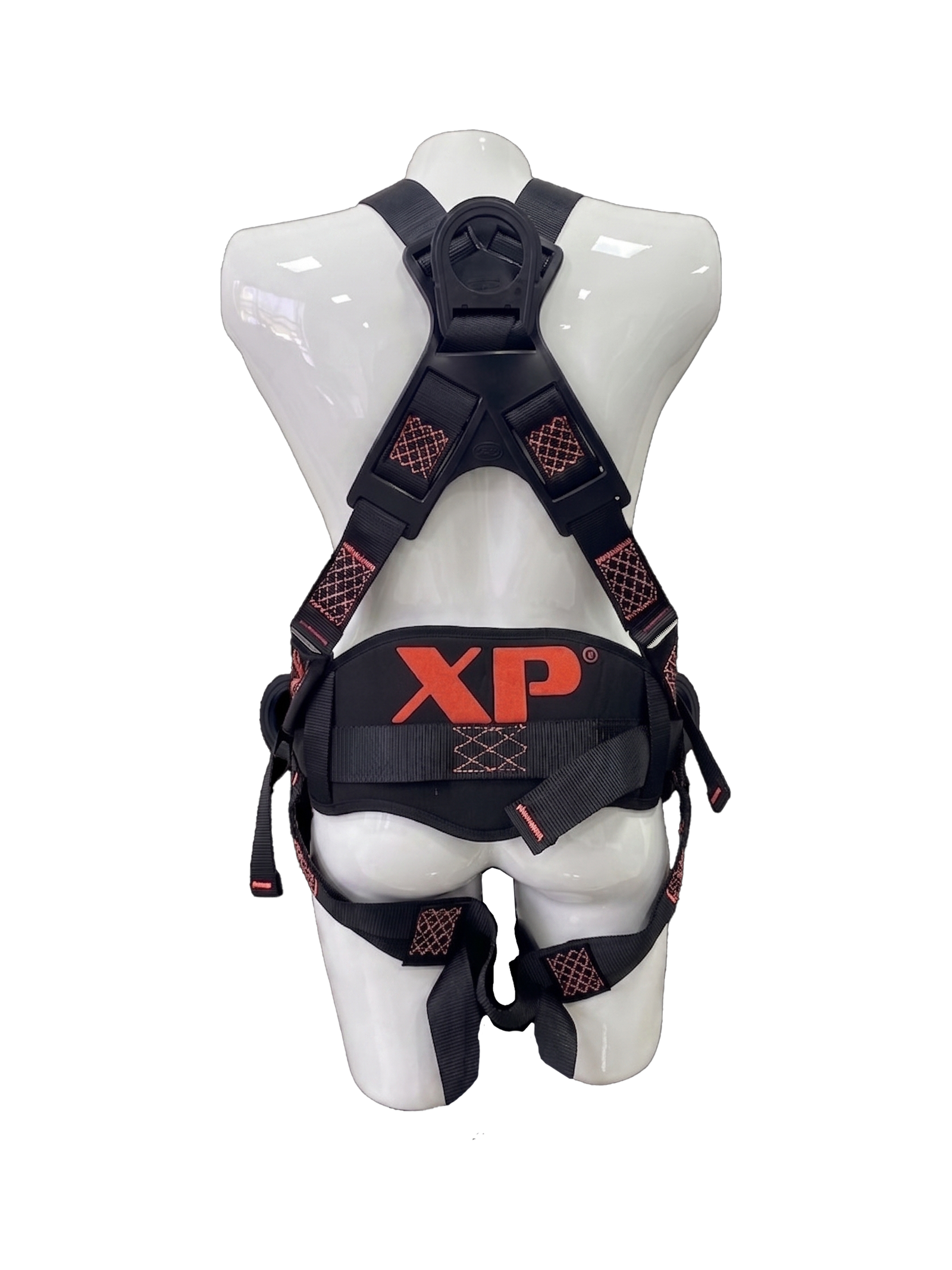 Arnés en X en reata poliéster, de cuerpo entero con soporte lumbar, de 4 argollas de 5000 lb y 9000 voltios, distribuidas así: 1 argolla dorsal tipo “D” para detención y/o restricción de caídas, 1 argolla esternal tipo “D” para ascenso y descenso controlado, 2 argollas de cadera tipo “D” para posicionamiento y/o restricción, 2 porta eslingas elaborados en cinta con broche para sujetar los ganchos en reposo (NO ES PORTA HERRAMIENTA) y soporte lumbar con reata en poliéster.